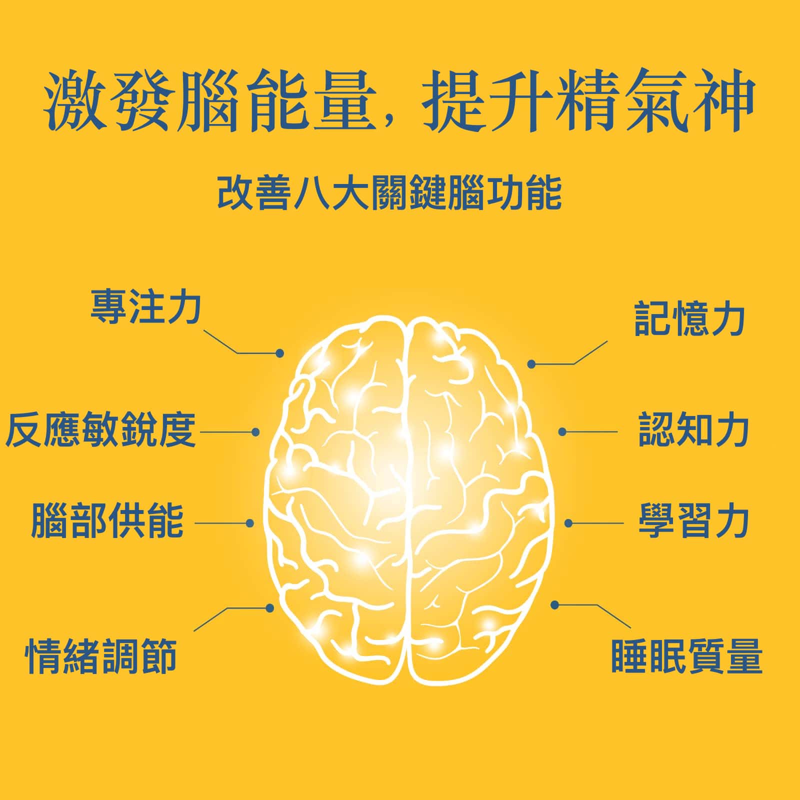 Diagram of a brain with labeled functions on a yellow background, promoting brain health and improvement.